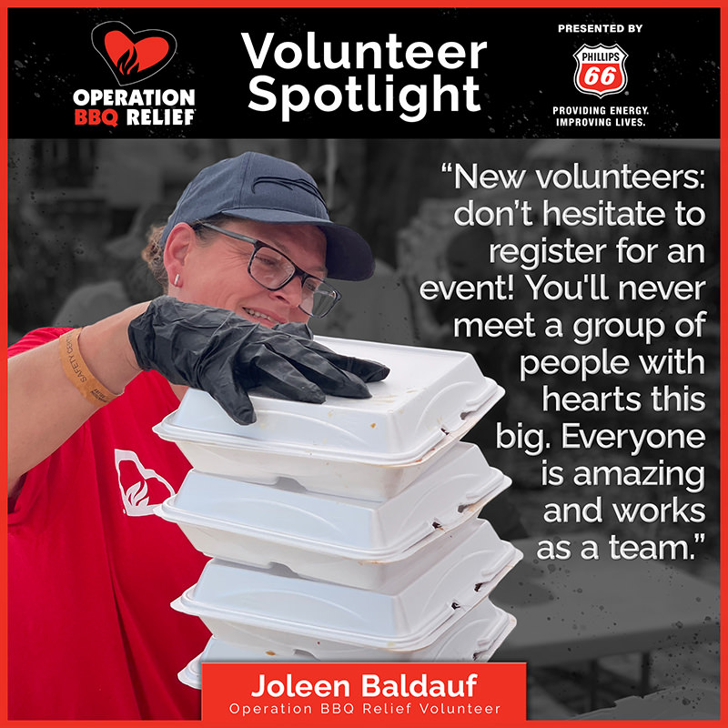 Joleen Baldauf’s journey to become an Operation BBQ Relief volunteer began just a few short months after we provided our first meals in the aftermath of the Joplin, Mo. tornado in May 2011.