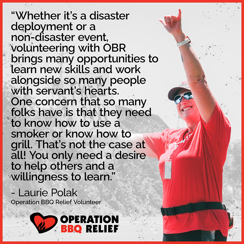 “Whether it’s a disaster deployment or a non-disaster event, volunteering with OBR brings many opportunities to learn new skills and work alongside so many people with servant’s hearts,” Laurie said. “One concern that so many folks have is that they need to know how to use a smoker or know how to grill. That’s not the case at all! You only need a desire to help others and a willingness to learn.”